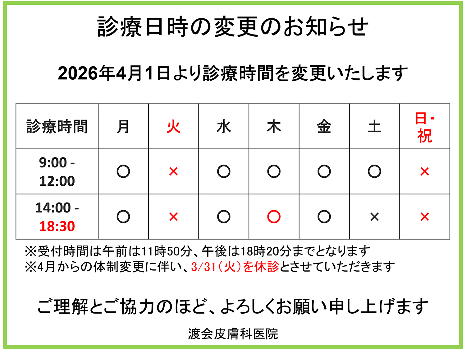 2026年4月1日より診療時間を以下の通り変更させていただきます。